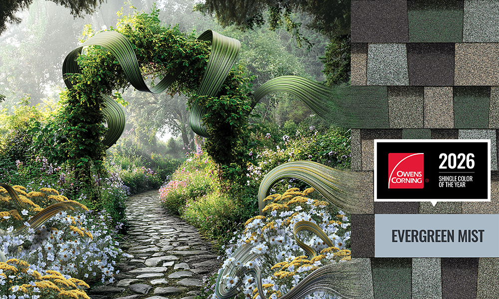 Owens Corning TruDefinition® Duration® Designer shingle, Evergreen Mist is the 2026 Shingle Color of the Year